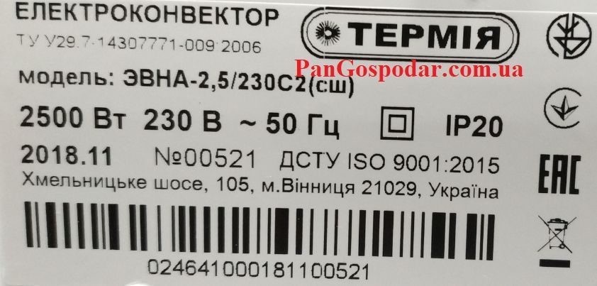 Характеристики:Мощность: 2,5 (кВт)Объем* обогреваемого помещения: 130/(100) (м3)Тип терморегулятора: электромеханическийРежимы работы 2 ступени: 1,25/2,5 (кВт)Нагреватель ленточный ("игольчатый")Ток потребления: 5,8-6,9 (А)Напряжение питания: 220 (В)Терморегулятор: даВес: 4,9 (кг)Гарантия: 5 (лет)Габаритные размеры: 89х45х11 (см)Сертификат: УкрСЕПРО* Значение объёма приведено ориентировочно, и справедливо при условии средней теплоизоляции помещения. В скобках указан объём обогреваемого помещения, если электрический конвектор используется как основной источник тепла и работает круглосуточно. Без скобок приведено значение объёма, если обогреватель используется для дополнительного обогрева.Более точный выбор мощности должен проводиться путём теплотехнических расчётов, где учитываются фактические тепловые потери конкретного помещения.** размер электрического конвектора с учетом монтажных кронштейнов для настенной установки.