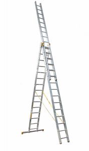 Лестницы трехсекционные алюминиевые универсальные 3 х 9 секционные состоят из трех блоков, выполненных из алюминия и соединенных шарнирными механизмами, которые позволяют выдвигать секции в разных направлениях. В итоге стремянки 3 х секционные (их еще называют телескопическими) дают возможность выполнять ремонтные и строительные работы на довольно большой высоте.