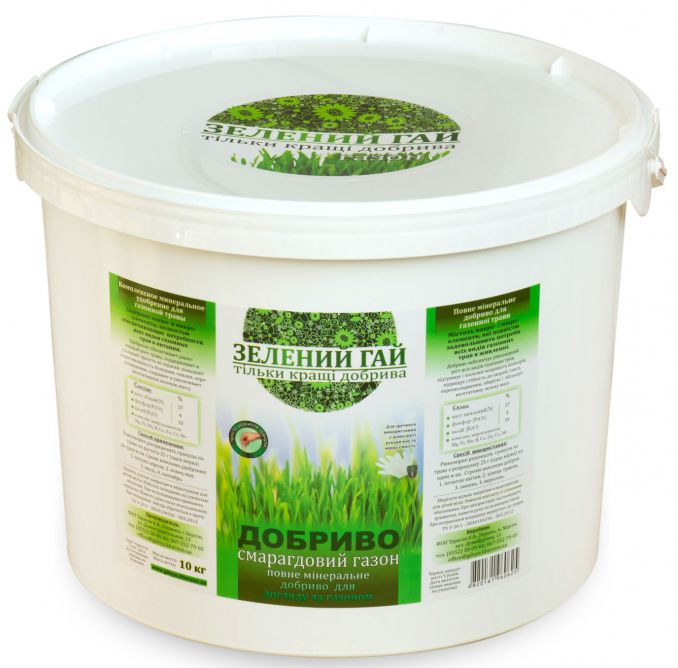 Зелений Гай Смарагдовий газон - комплексне мінеральне добриво для всіх видів газонної трави. Посилює яскравість забарвлення трави, підвищує стійкість до захворювань, гнилі, переохолодження, а також сприяє збільшенню вегетативної маси.