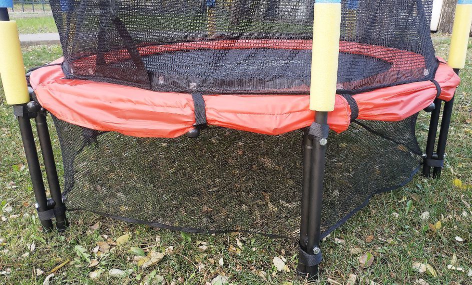 Конструкция батута, благодаря использованию резиновой веревки, закрыта прочным чехлом из PVC и защитной ограждающей сетки, которая держится на стойках, закрытых в вспененный полиэтилен сделает тренировки ребенка на батуте безопасными и комфортными.