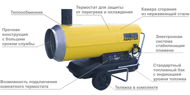Тепловая пушка MASTER - нагреватель воздуха непрямого нагрева. Применяются для отопления бытовых, складских, производственных и сельскохозяйственных помещений, экономичного обогрева и сушки объектов в строительстве. Дизельные тепловые пушки не требуют специального монтажа. Они просты и надежны в эксплуатации. Эффективность сгорания топлива в них достигает 100%.