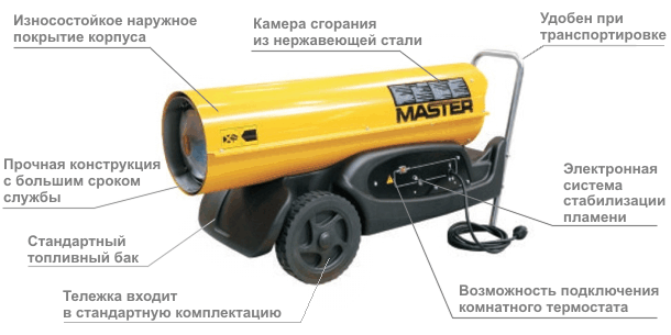 Нагреватели воздуха с прямым нагревом MASTER - это теплогенерирующая установка которая подает нагретый воздух непосредственно в помещение, которое необходимо обогреть. Для сжигания применяется керосин или дизельное топливо (печное бытовое). Корпус нагревателя имеет хорошую теплоизоляцию, камера сгорания сделана из нержавеющей жаропрочной стали, а
