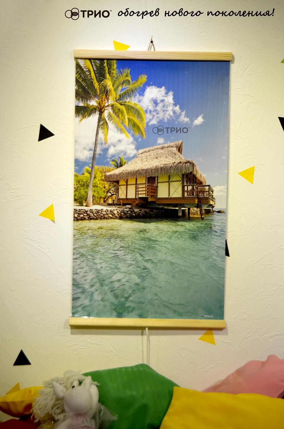 Пленочные обогреватели ТРИО предполагают собой цветное полотно с древесными планками сообразно краям, с нанесенными различными изображениями. Снаружи он мало чем напоминает обогреватель, и более схож на элемент интерьера, но сразу опосля его включения вы можете поставить по достоинству его преимущества.