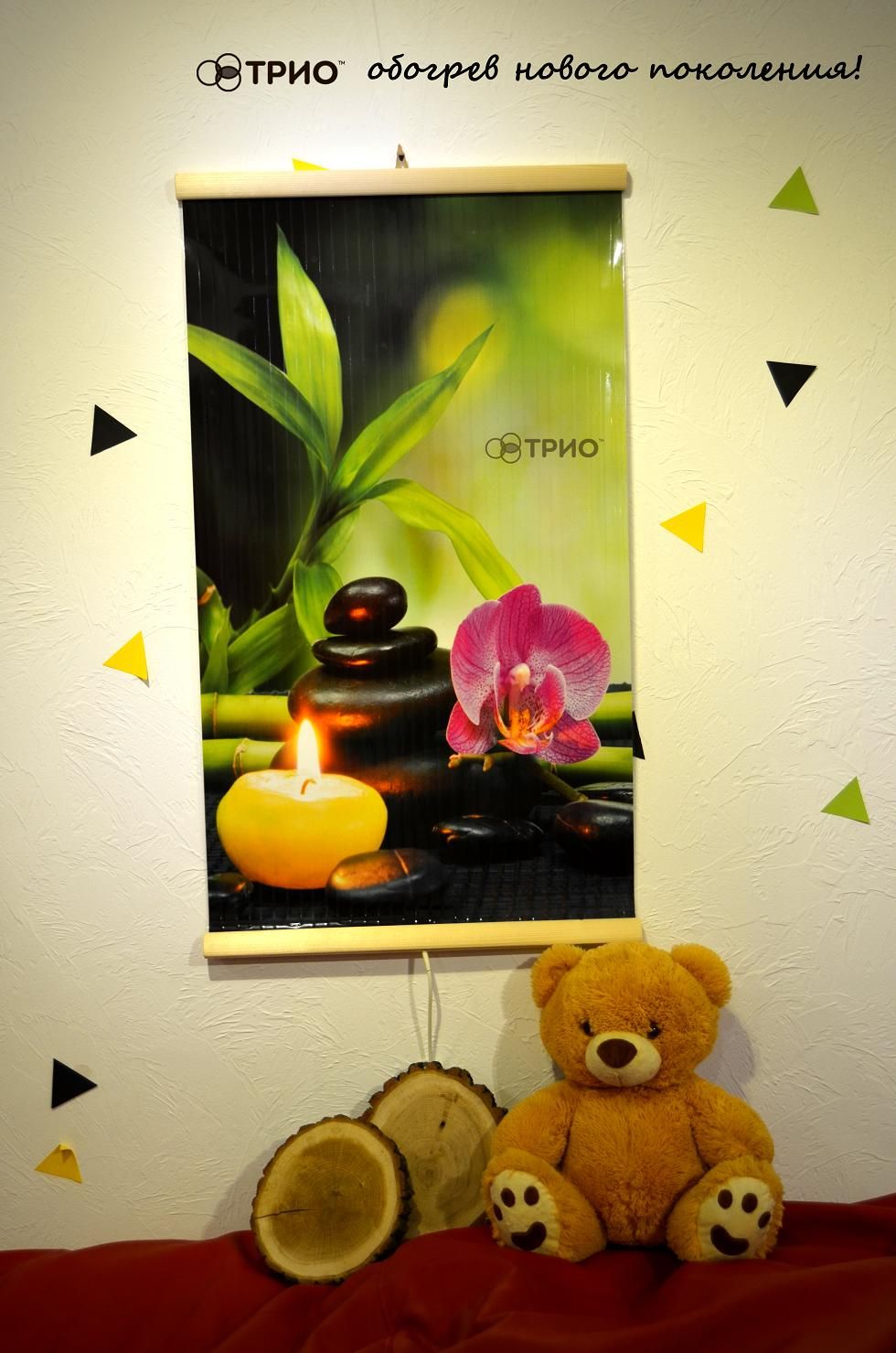 Пленочные обогреватели ТРИО Гармония предполагают собой цветное полотно с древесными планками сообразно краям, с нанесенными различными изображениями. Снаружи он мало чем напоминает обогреватель, и более схож на элемент интерьера, но сразу опосля его включения вы можете поставить по достоинству его преимущества.