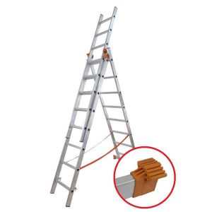 Универсальная 3-х секционная лестница из крепкого алюминиевого сплава. В зависимости от ситуации, конструкция может быть использована в качестве свободностоящей стремянки, приставной либо выдвижной лестницы. Каждая ступень изделия имеет специальную ребристую поверхность, за счет чего обеспечивается надежное и безопасное использование. Еще в модели используются гибкие пластиковые упоры, позволяющие установить ее на любой плоскости.