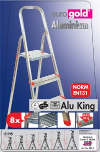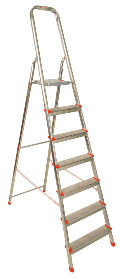 Стремянка усиленная алюминиевая с 7 алюминиевыми ступенями, размер (a-228,5cm; b-150cm; c-325cm; d-122,5cm; e1/e2-30/54cm), допустимая нагрузка макс. 150кг, цвет пластика - красный. Профиль размеры мм: передний профиль 40x24, задний профиль 35x24. Толщина профиля -на 7ступ - 1,45. Толщина ступеней 1,0. Толщина верхней площадки - 0,9. В данной серии присуствует фартук для инструментов.
