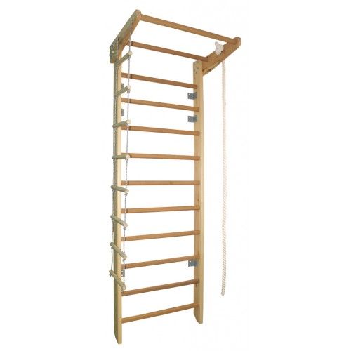 Шведская стенка с турником изготовлена из массива сосны высокого качества, все детали тщательно обработаны и не содержат шероховатостей, покрыты несколькими слоями безопасного лака без запаха, что увеличивает срок службы шведской стенки, все видимые винты закрыты заглушками. Применение буковых перекладин позволяет выдерживать нагрузку до 100 кг.