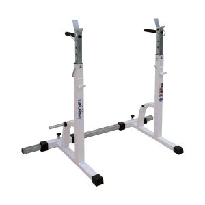 Телескопический механизм регулировки стоек по высоте и ширине обеспечивает удобство и гарантирует правильность выполнения различных упражнений. Штанга может быть размещена на любой высоте от 1040 мм до 1580 мм с шагом 60 мм. Возможность регулировки стоек по ширине дает возможность применения разнообразных грифов олимпийских, коротких тренировочных, W- и EZ- образных.