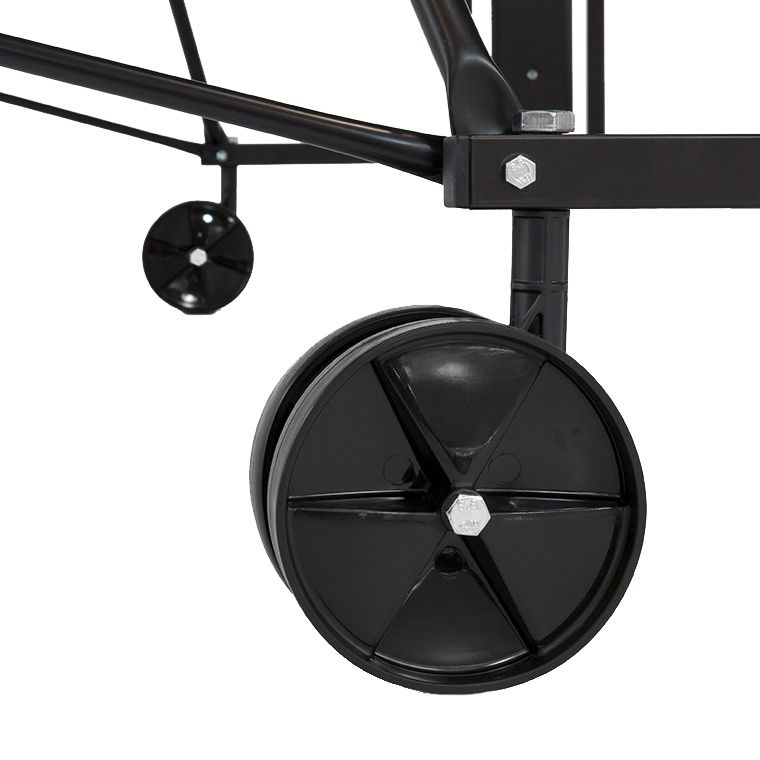 Стол оснащен 4 двойными транспортировочными поворотными колесами диаметром 125 мм, что существенно облегчает транспортировку оборудования при необходимости. В комплект также входит сетка размером 180х15,2 см и держатель для ракеток и мячей.